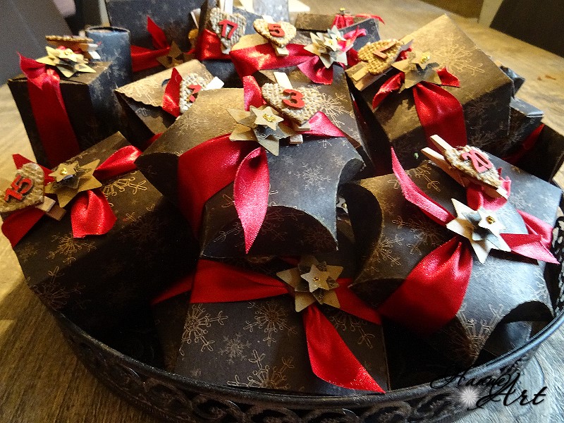 Mein Kalenderle von Maja, ist in lauter schön verzierten Dosen verpackt, Wie hast du die Dosen denn unten aufbekommen Maja, ich wollte auch schon mal so ein verpacktes Geschenkle machen aber irgend wie bekam ich die Dosen von unten nicht auf, bin ich blöd oder nur mein Dosenöffner? Aber nun kuckt erst mal.